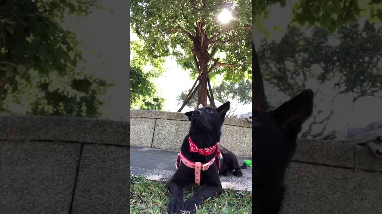 Sakura is a female black hybrid dog that lives in Taipei. She is sitting and relaxing under trees and finds something and looking at it.