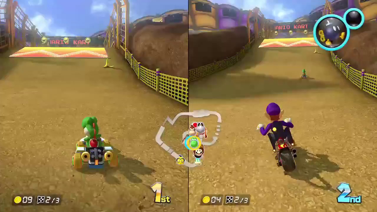 This is a replay from a round of Mario Kart 8 Deluxe I had with my dad. My dad being player 1 (Yoshi) And me being player 2 (Waluigi)