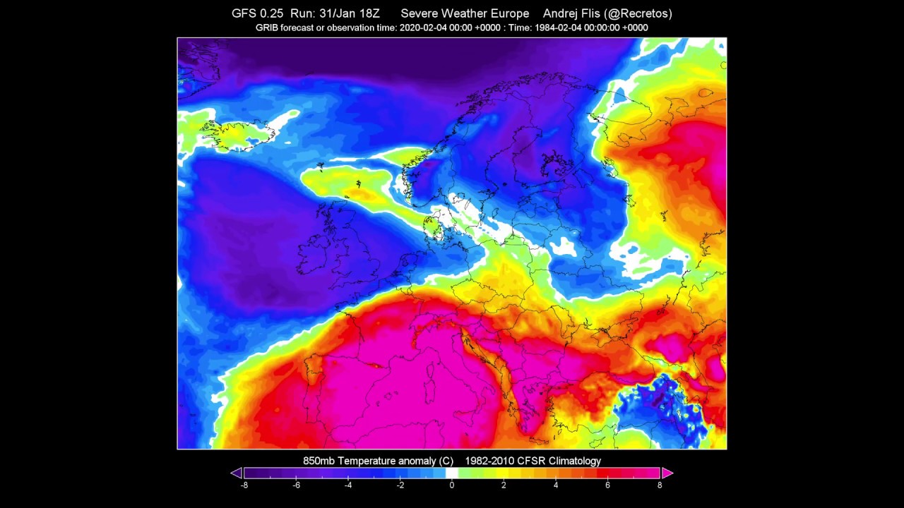 Cold outbreak over Europe, February 2020 - GFS 850mb Temperature anomaly - Severe Weather Europe
